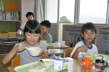 今日の給食は冷やし中華とチーズロール、パイン・ミニトマトです。おいしくいただいています。