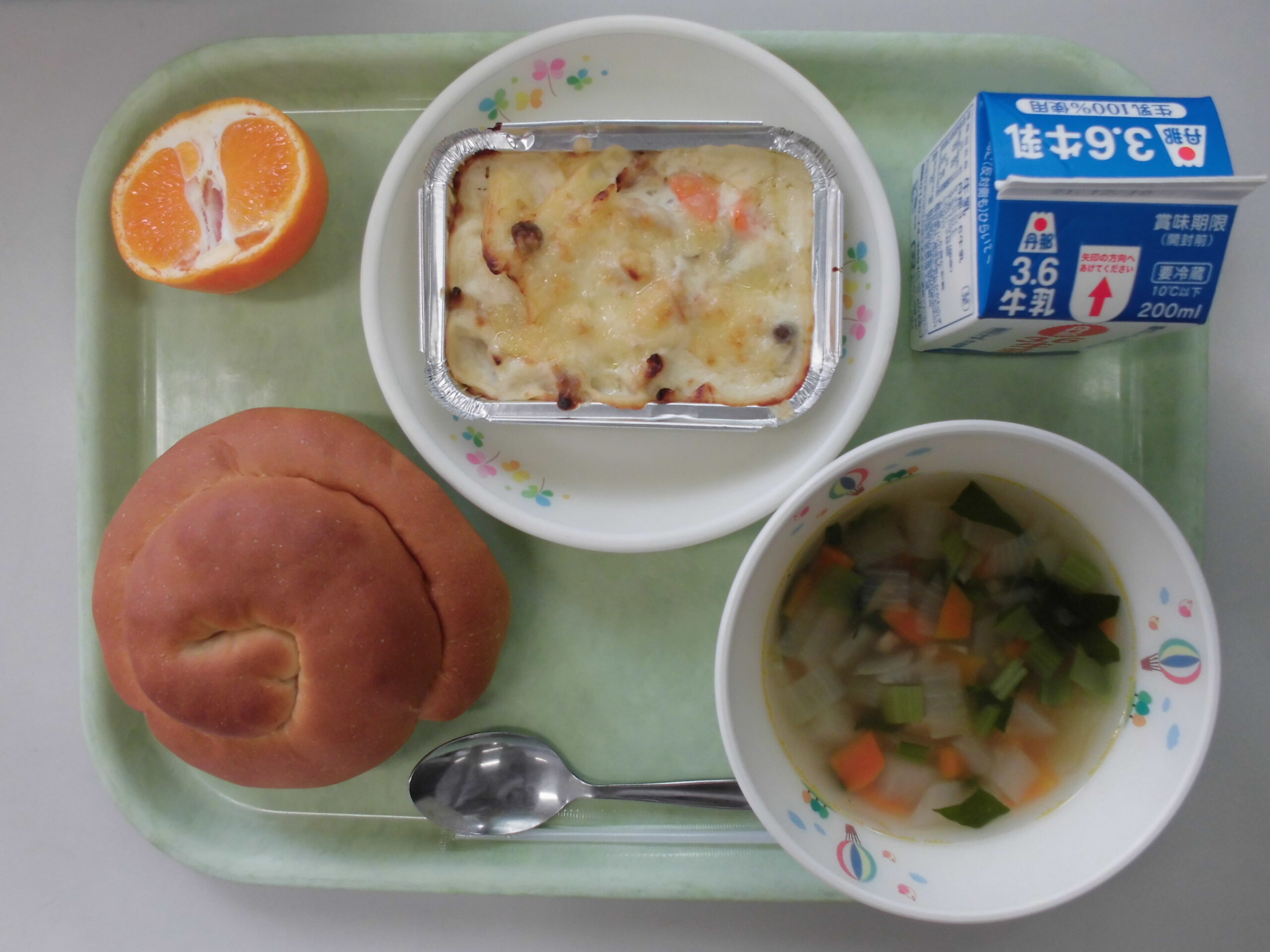 メニューは「・黒糖入りうずまきパン ・チキングラタン(丹那産の牛乳と生クリームを使用) ・大根スープ(函南産の大根を使用) ・みかん(静岡産)」でした。